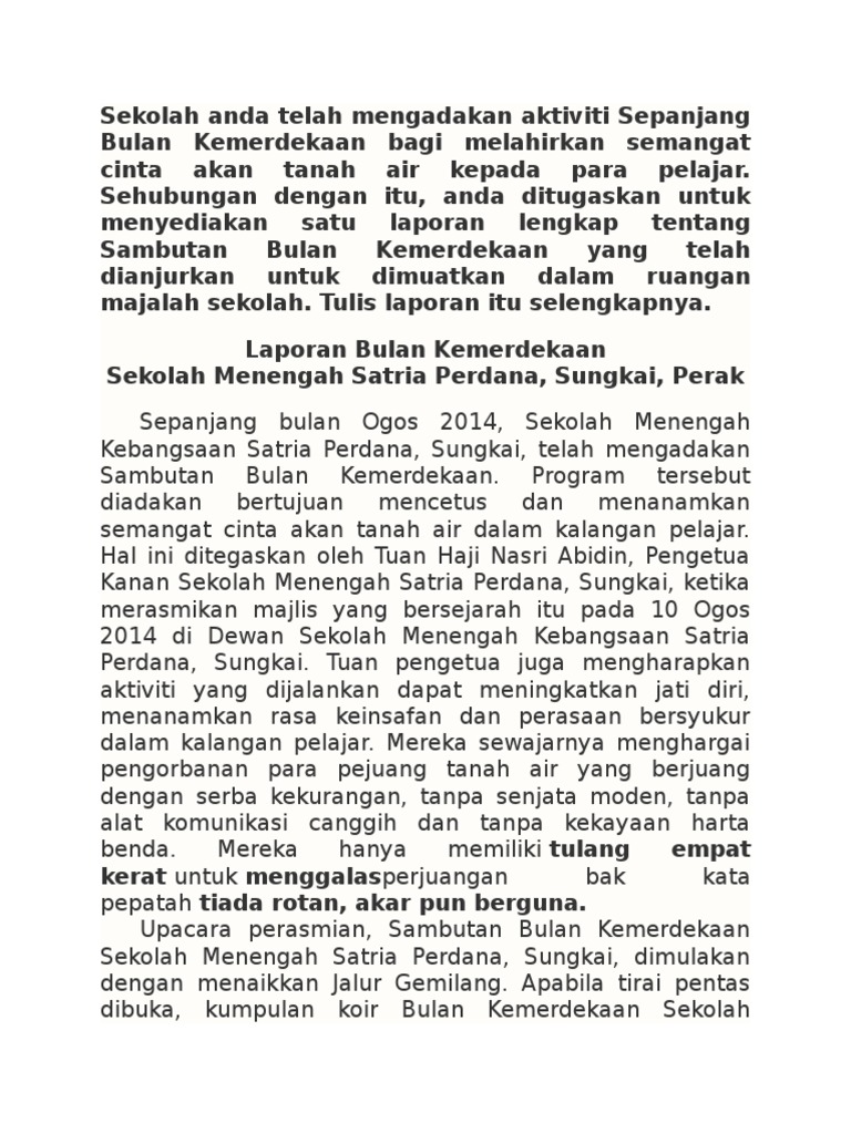 Contoh karangan laporan pt3. Contoh karangan spm laporan tentang kejadian bencana alam. Sekolah anda telah mengadakan aktiviti sepanjang bulan kemerdekaan bagi melahirkan semangat cinta.